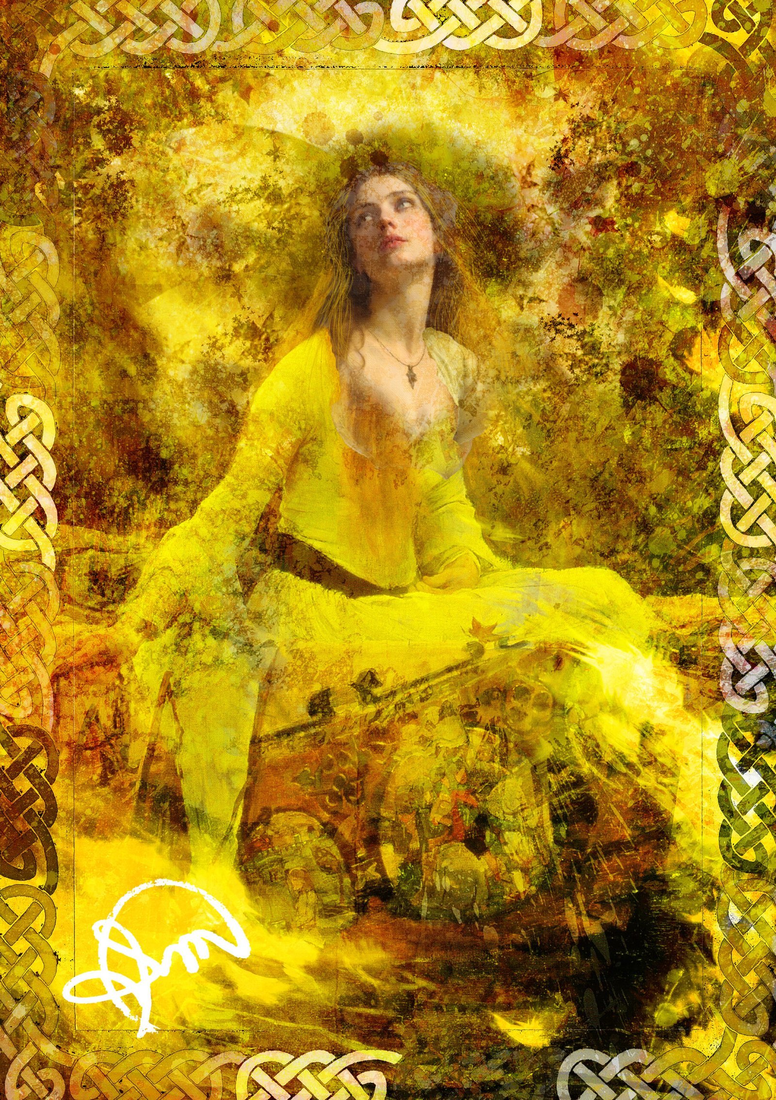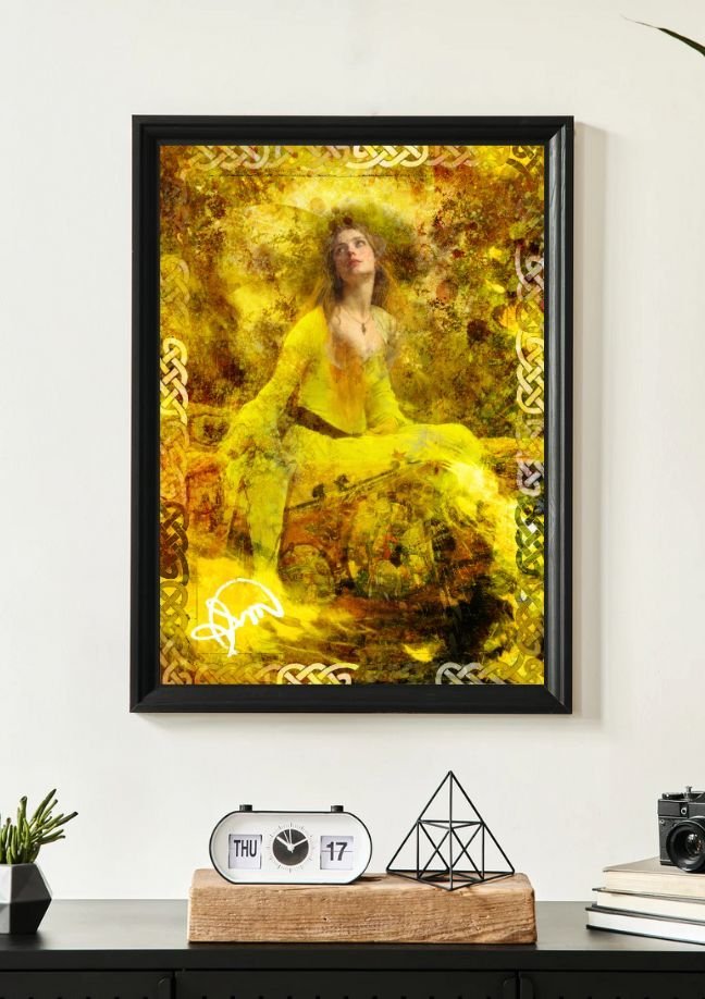 Em A Aurora Dourada, a figura central resplandece em tons de amarelo, como se personificasse o nascer do sol em todo seu esplendor. O fundo abstrato, com suas texturas vivas e cores quentes, cria uma aura de energia pulsante e transformação.