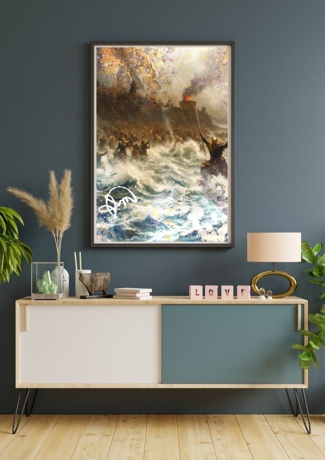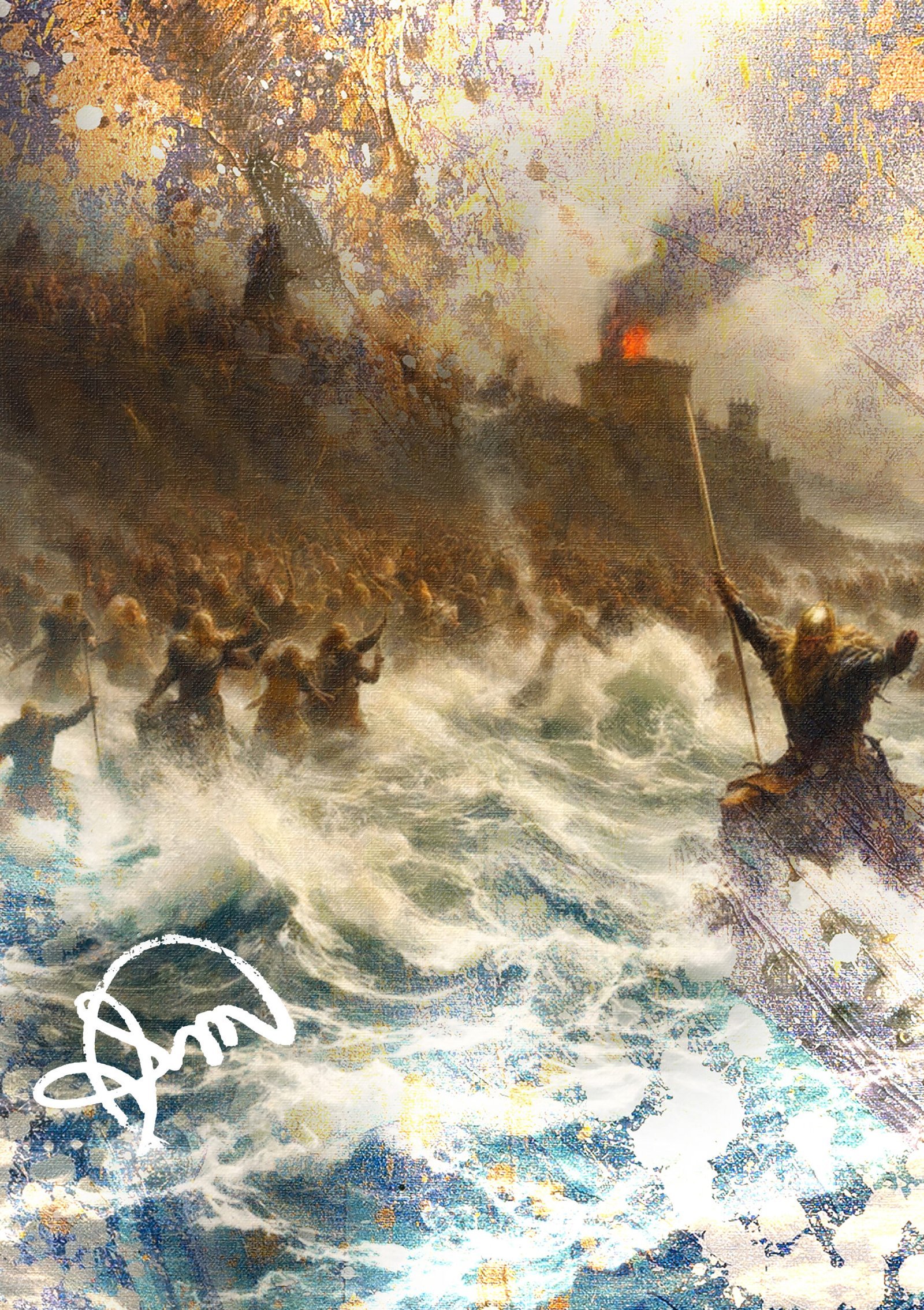 A composição de Chamas do Destino mergulha o observador em uma narrativa de coragem e resistência em meio ao caos. O cenário marítimo é dominado por ondas violentas e o reflexo das chamas, enquanto guerreiros avançam em direção a uma fortaleza em ruínas, coberta por fumaça e fogo.