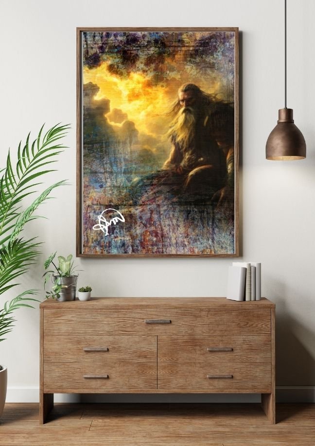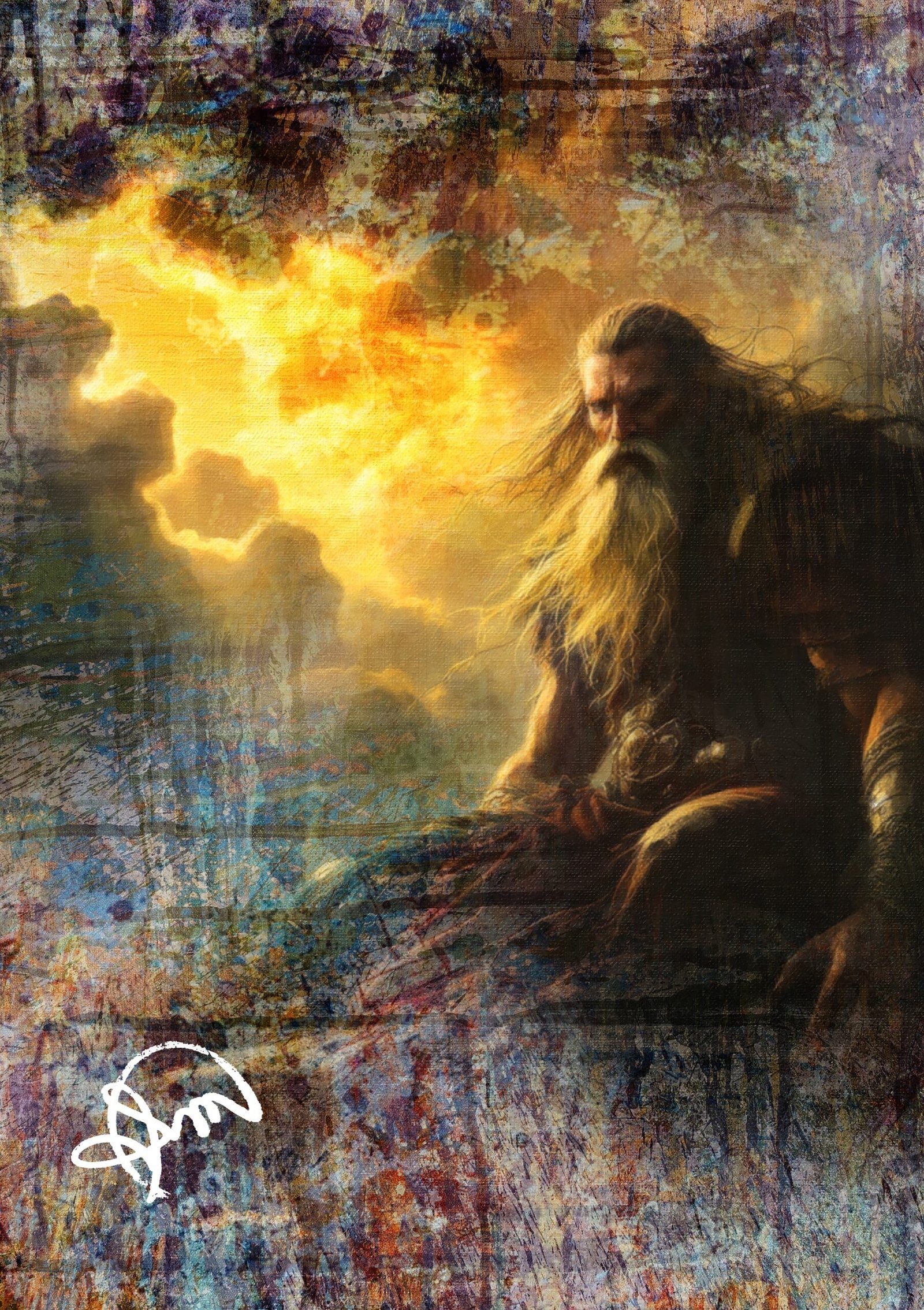No limiar entre o etéreo e o terreno, repousa uma figura silenciosa, envolta em sombras e mistérios. Seu cabelo dança no vento, como se sussurrasse segredos aos céus dourados que se estendem ao fundo. Esse é o cenário da obra Chamas do Horizonte Perdido.