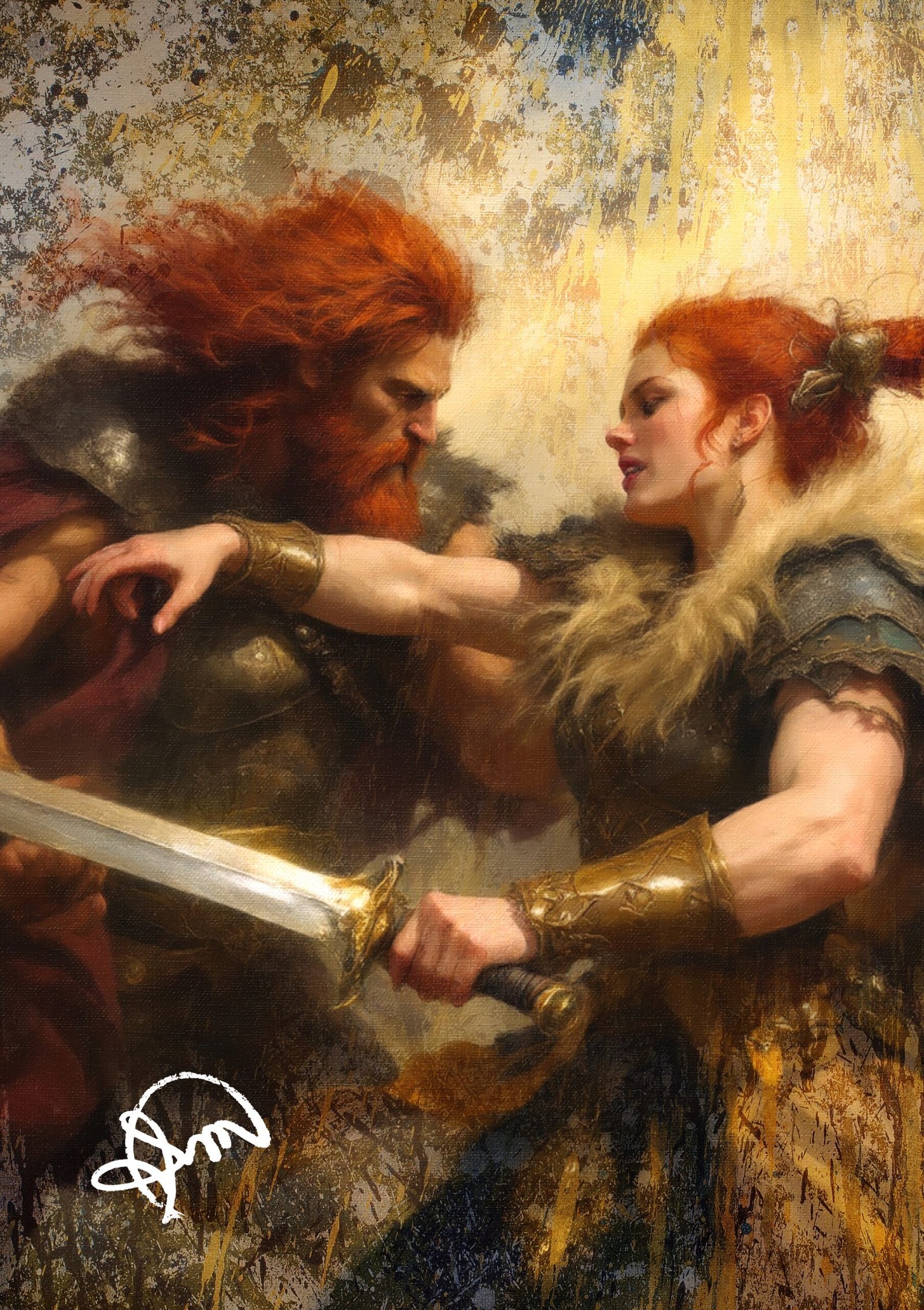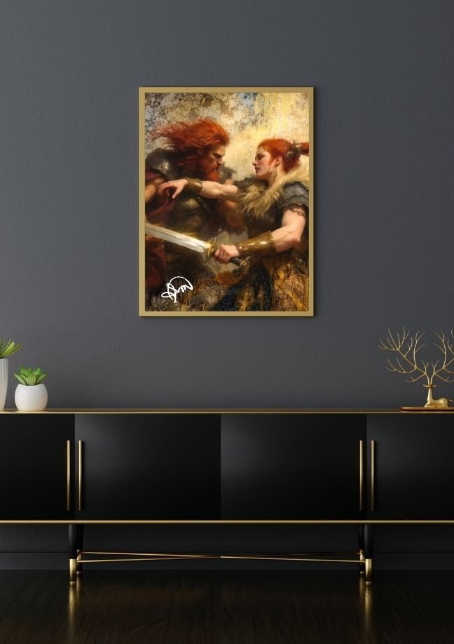 O cenário abstrato ao fundo, com pinceladas dinâmicas em tons dramáticos, sugere caos e movimento, intensificando a tensão da cena. O uso estratégico de luz e sombra acentua a dramaticidade, dando vida às personagens, enquanto cada detalhe nas armaduras e expressões transmite uma narrativa de coragem e conflito.