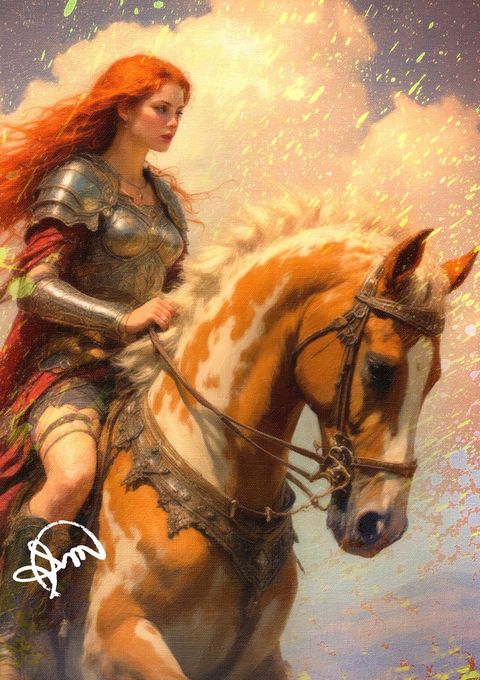 Montada em um imponente cavalo alazão, sua presença é marcada pela força e pela liberdade, enquanto o movimento de seu cabelo ruivo parece ecoar os ventos do destino.