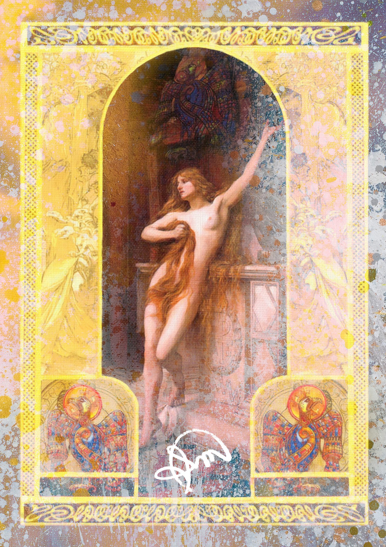 Ecos do Entardecer retrata uma cena de contemplação solitária em meio à vastidão da natureza. A figura feminina repousa em uma pose introspectiva, cercada por tons suaves de dourado e lilás que evocam o encanto do crepúsculo.
