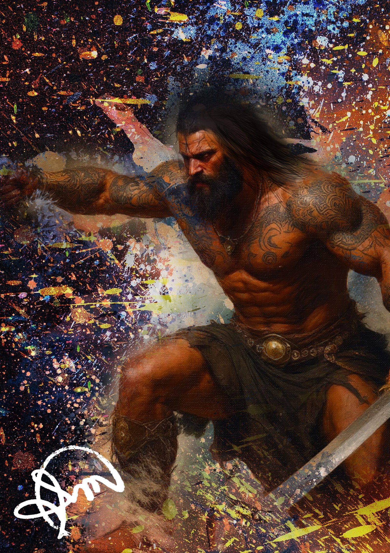 Em Guerreiro Entre Estrelas, um guerreiro emerge como a personificação de força e determinação em meio a um cosmos em ebulição. As tatuagens tribais em seu corpo ecoam tradições ancestrais, enquanto sua postura decidida com a espada reflete uma energia implacável.