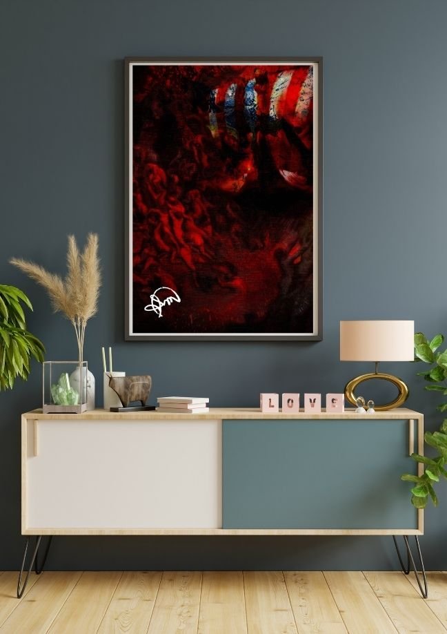 Maré de Fúria explora a tensão entre ordem e caos, com cores intensas e contrastes marcantes transmitindo uma energia visceral. O fundo em tons de vermelho e preto evoca conflito, enquanto formas orgânicas e abstratas parecem emergir em movimento constante.