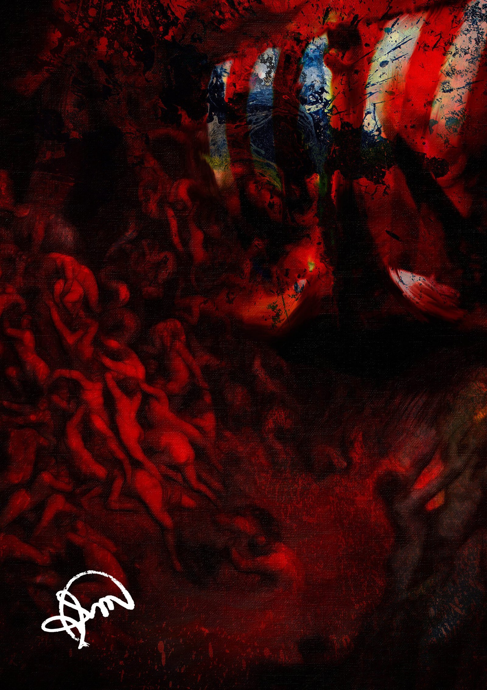 Maré de Fúria explora a tensão entre ordem e caos, utilizando cores intensas e contrastes marcantes para transmitir uma energia visceral. O fundo dominado por tons de vermelho e preto evoca uma sensação de conflito, enquanto formas orgânicas e abstratas parecem emergir em um movimento constante.