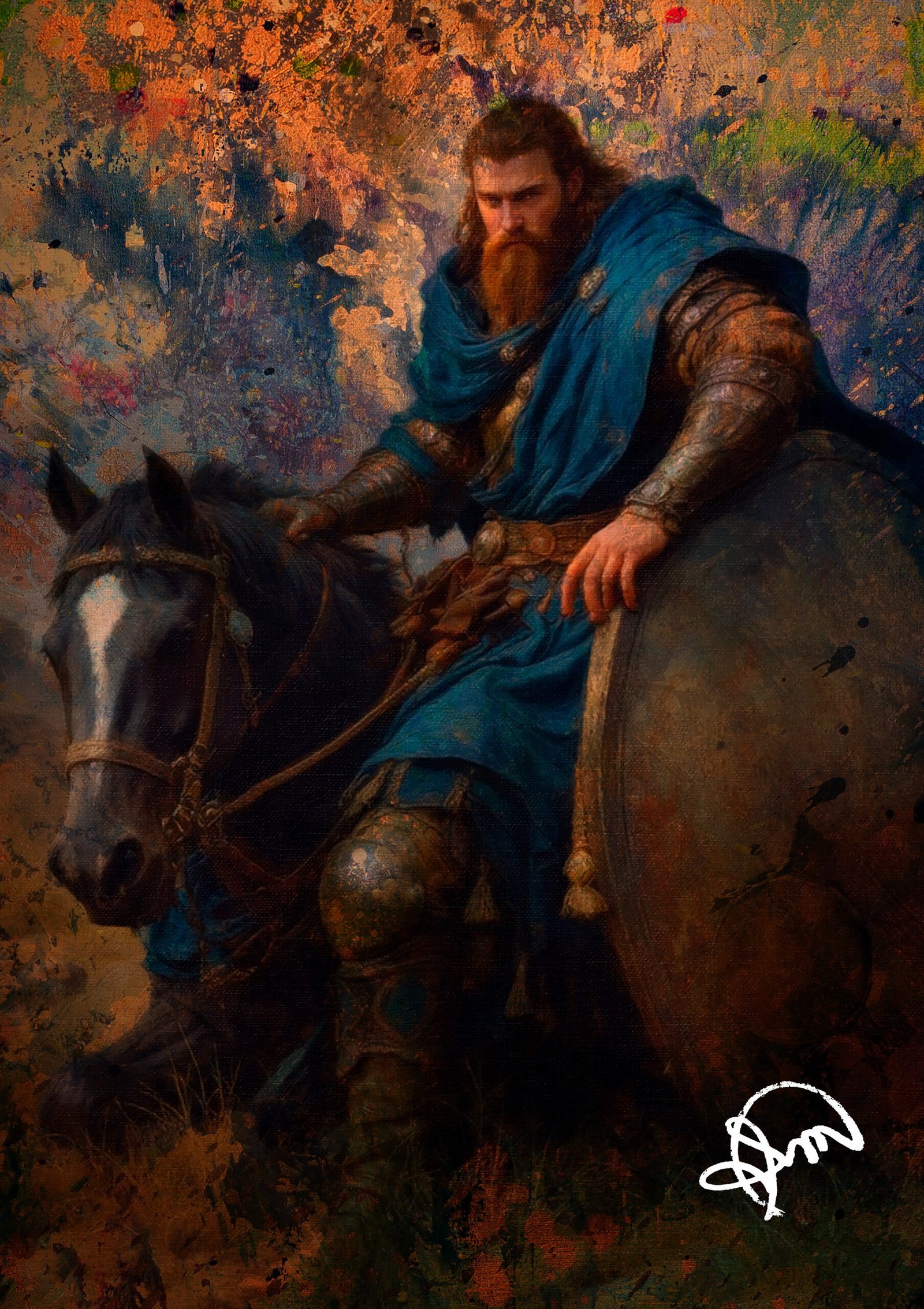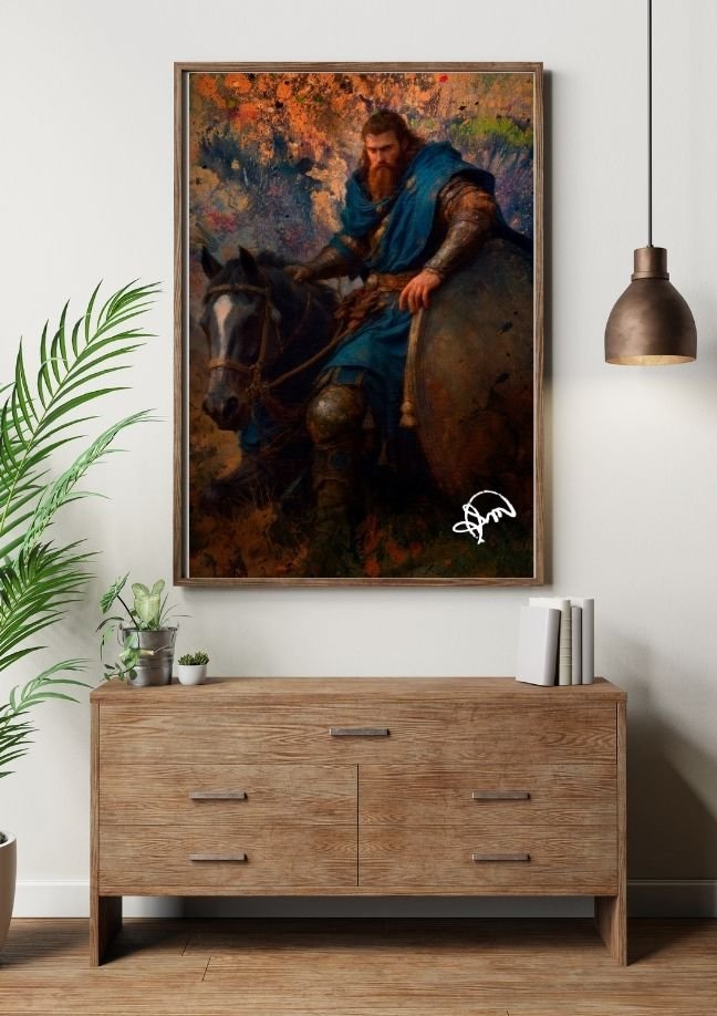 O Destino Entre Luz e Sombras nos transporta para um universo de heroísmo e mistério, retratando um imponente cavaleiro medieval montado em seu fiel corcel. A armadura meticulosamente elaborada e a capa azul evocam um guerreiro de distinção, talvez, um protagonista lendário de contos épicos.