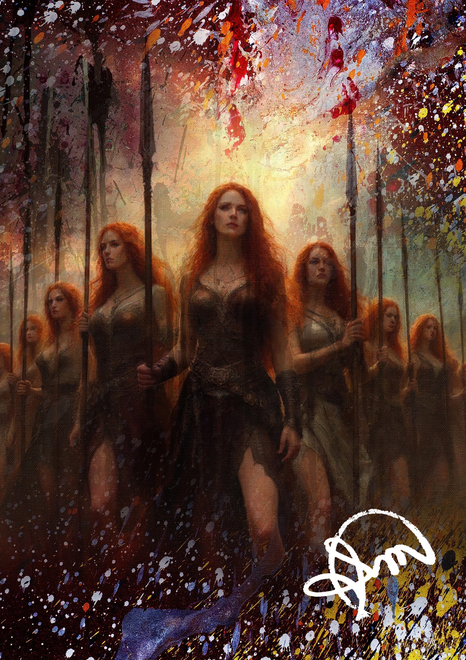 Em Valquírias do Firmamento Ardente, nos é apresentado um poderoso grupo de mulheres guerreiras, destacadas em uma formação que exala força e determinação. Cada figura, adornada por armaduras elaboradas e segurando lanças, é uma manifestação da união e coragem feminina.