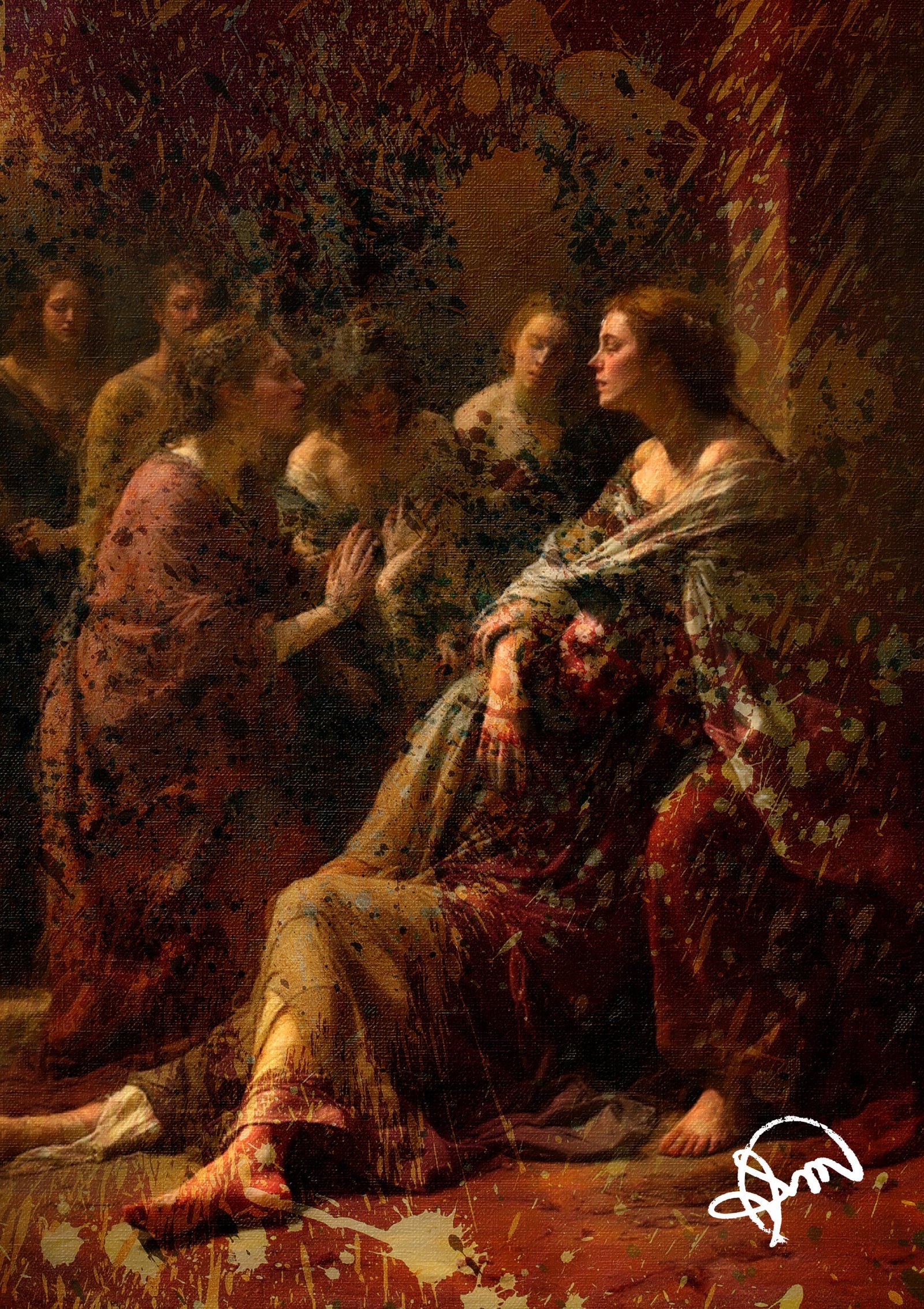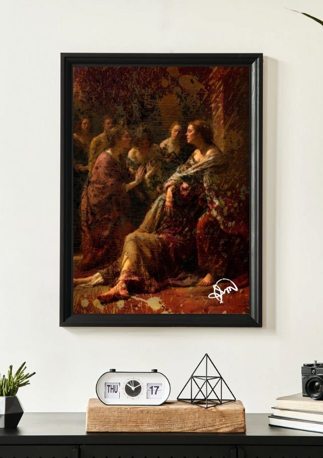 Vozes do Passado é um mergulho fascinante na interação humana, destacando a relação entre figuras em um momento de aparente comunhão e introspecção. As vestes das figuras, cuidadosamente detalhadas, remetem a um período clássico, trazendo uma sensação de atemporalidade à cena.